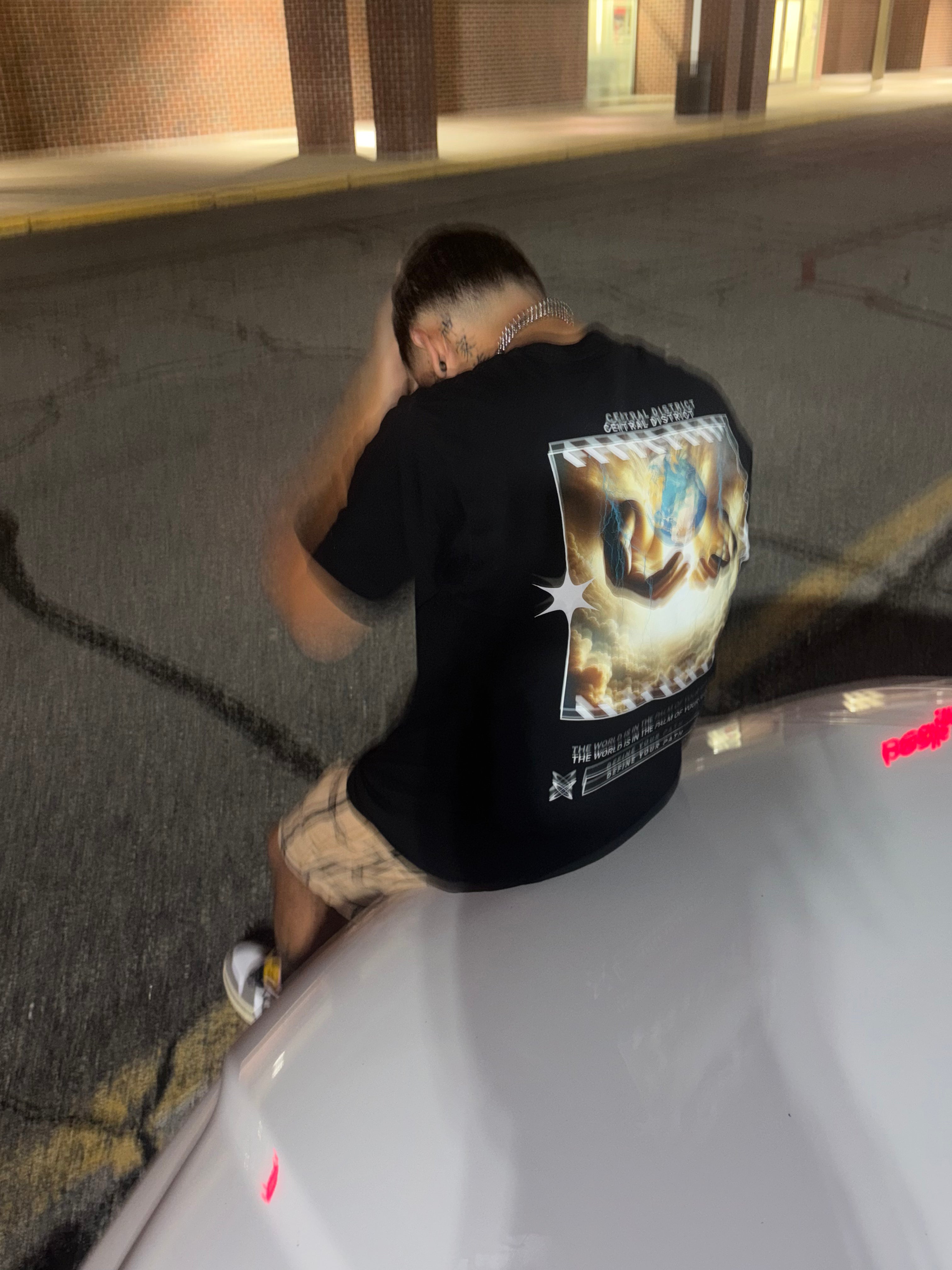 • Black t-shirt with graphic design and text on a gray background
